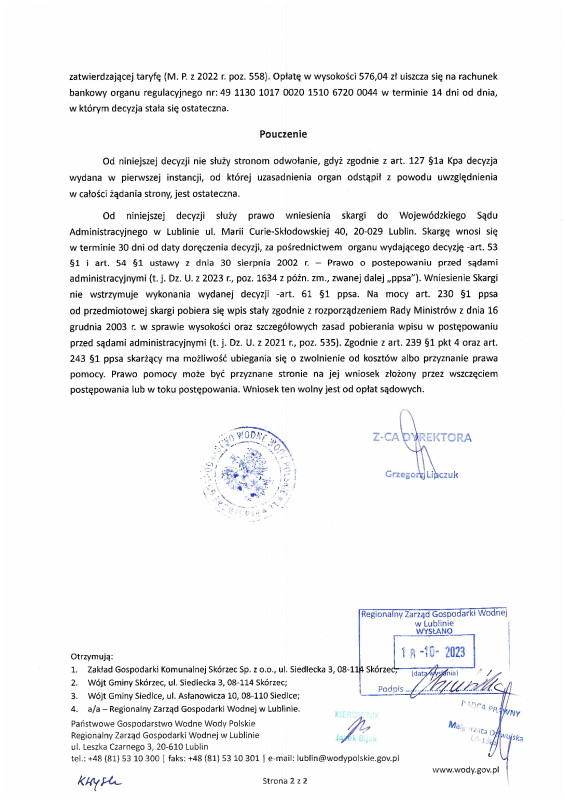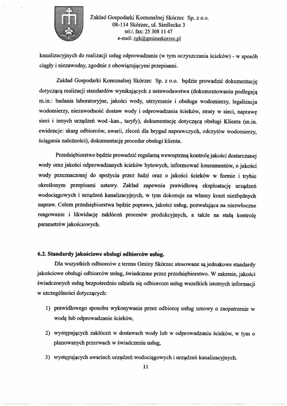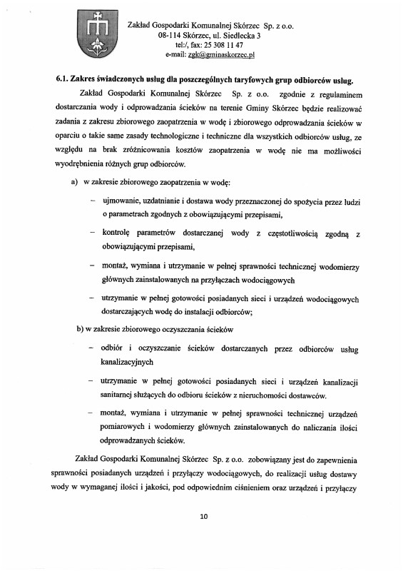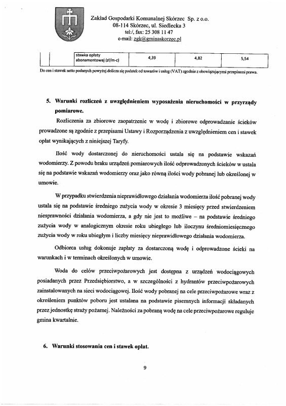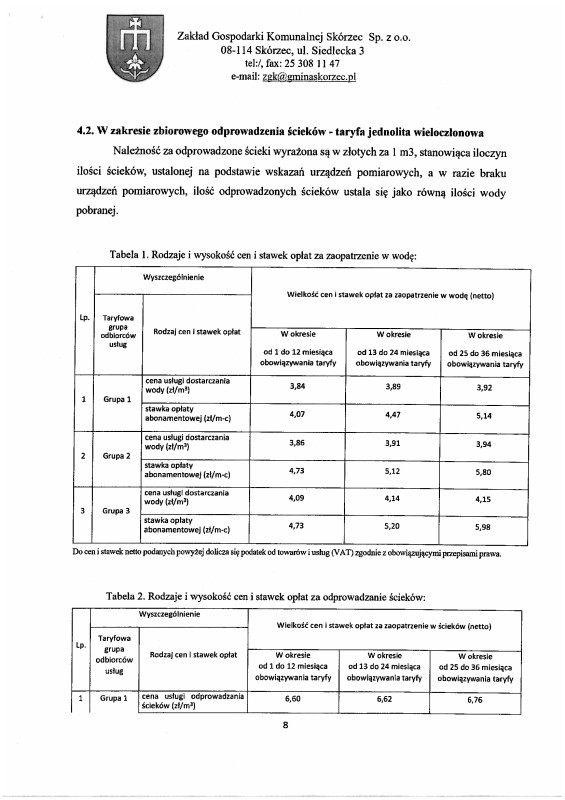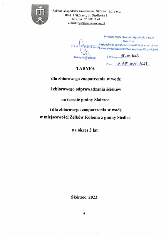 Taryfa dla zbiorowego zaopatrzenia w wodę i zbiorowego odprowadzania ścieków na terenie gminy Skórzec obowiązująca od 03.11.2023